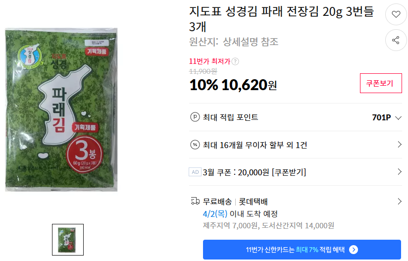 [11번가] 지도표 성경김 파래 전장김 20g 3번들 3개
