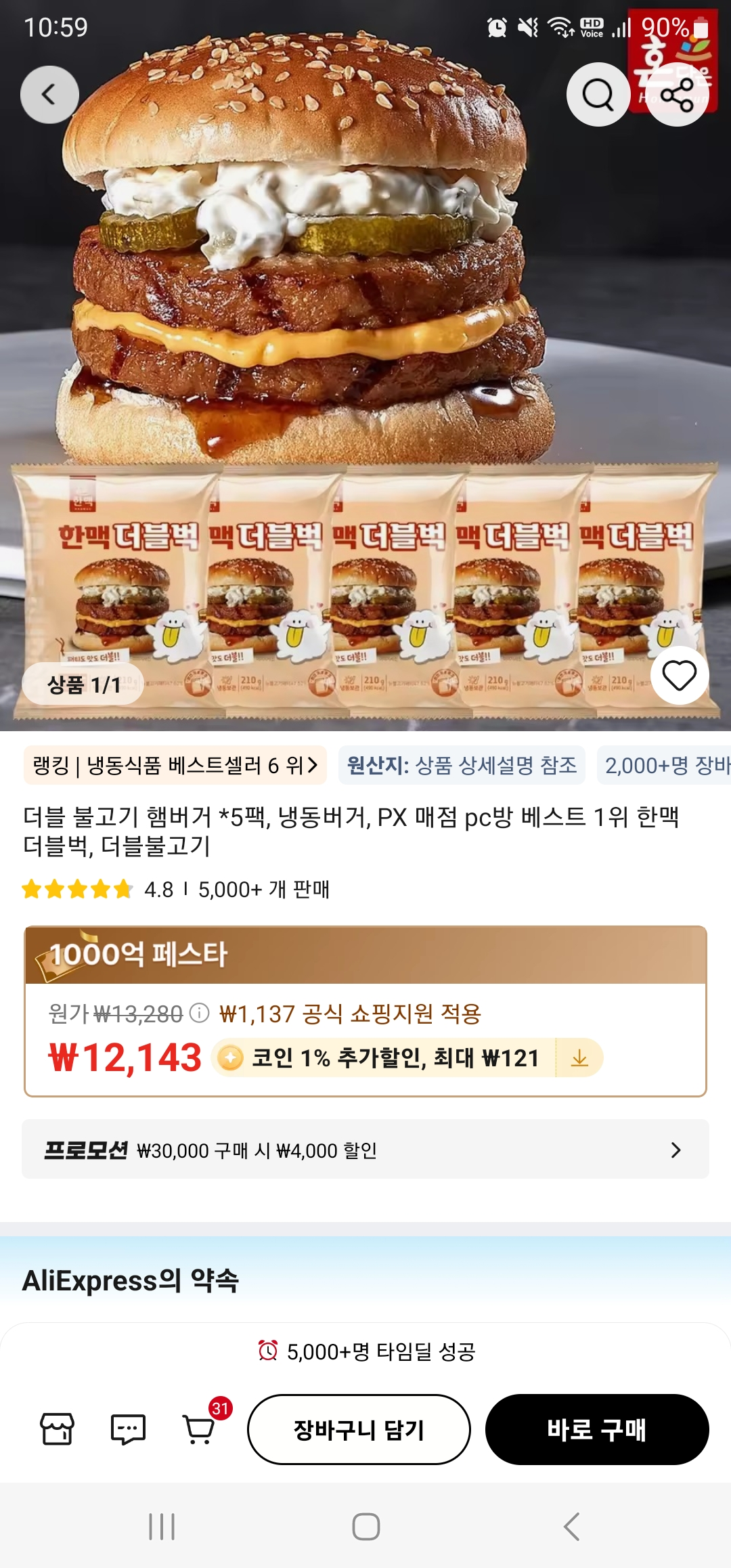 한맥 더블버거 더블벅, 210g, 5개 - 햄버거/샌드위치 | 쿠팡