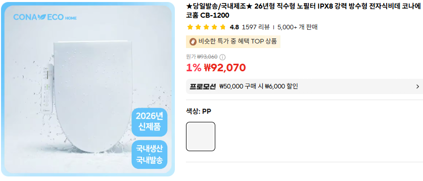 26년형 직수형 노필터 IPX8 강력 방수형 전자식비데 코나에코홈 CB-1200 최저가 소개합니다.